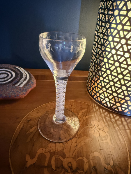 It’s an “engraved opaque twist wine glass” from 1760. It’s so beautiful sometimes I just look at it. Other times it glows rich and golden with shots of Fielden English rye whisky