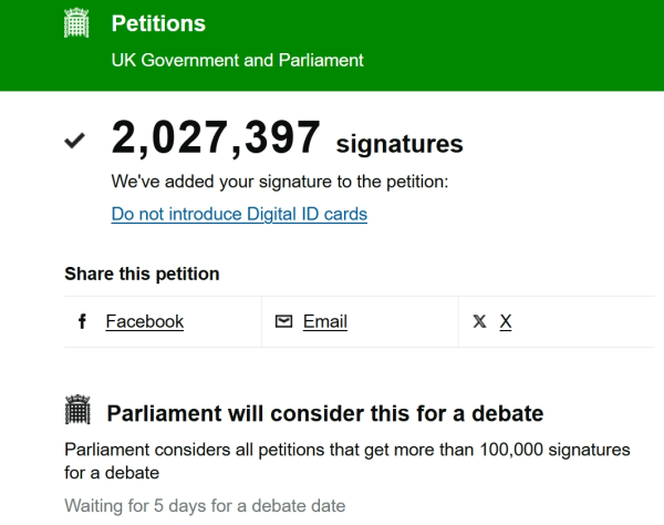 The 2 million petition is good news for Starmer-Reeves because it tells them how large is the demand not to have digital id – so they should introduce it as the default but with an option to buy your way out of it. That'll make a dent in the black hole. Every little helps