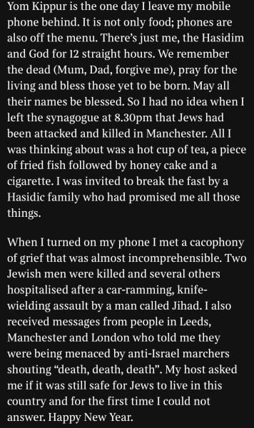 OT. It so happens that my sister and her vast family are members of the Heaton Park synagogue in Prestwich where the killing took place. They were there yesterday but thankfully undamaged. Indeed the last time I visited that synagogue was for the wedding of one of her children about five years ago.