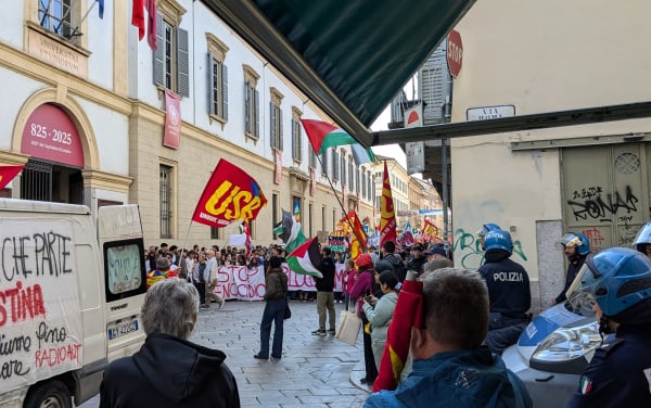 When I stepped out of Pavia University this morning it looked a bit dicky, as up the street one way it was blocked by a large Gaza demonstration, and the other way by a line of Italian riot police, with no way out other than back into the university. For a moment it didn't seem a great spot for me and the dog to be standing. But it all seemed to be passing off peacefully and the riot police didn't seem to see me or the dog as any threat. Second day running we've encountered large demonstrations here.