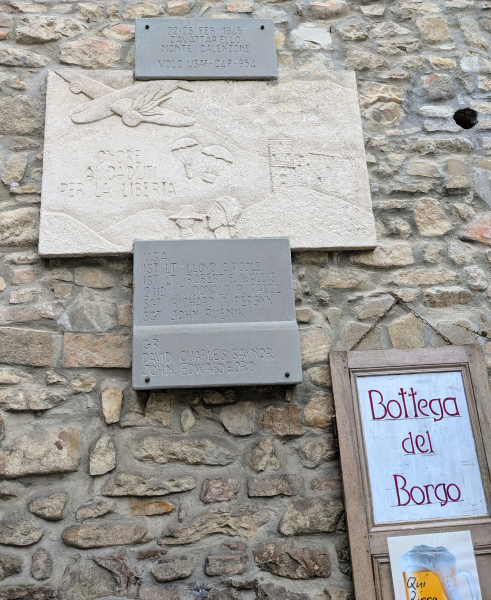 High up in the Apennines, in search of lunch, I came across what looks like a fairly new memorial to a wartime drop to the partisans. A US plane and crew with presumably two Brits along as SOE or intelligence.