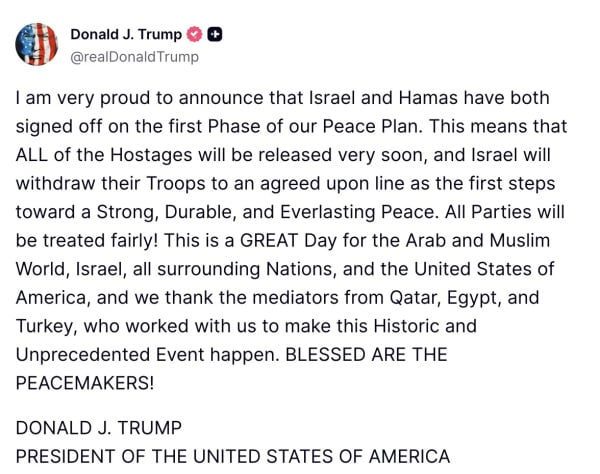 Secretary of State Marco Rubio whispers in the ear of President Donald Trump after handing him a note about a Middle East deal saying “Very close. We need you to approve a Truth Social post soon so you can announce deal first”