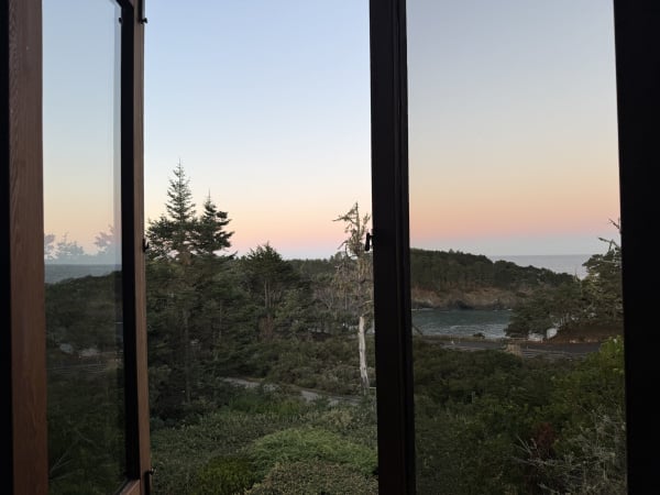I have just woken up, surrounded by dark spires of redwoods. I can hear the northern Californian surf, outside, battering the grey rocks into shale, as the sky turns from slate to silvery blue