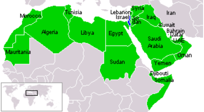 Arab League states (22 nations) = 1,300,000 sq. km. in total area (approx,) Israel = 20,000 sq. km in area (approx.), or 22,000 sq. km. including the territories.