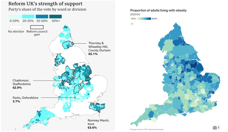 I know I keep banging this drum but welfare spending is perfectly in line with trends around obesity. You can draw a straight line from 2010 to now - COVID just accelerated the process somewhat. The scary thing is that health spending is growing even faster. That map misses out Wales - if you look at where Reform are doing well there, it's also in the spots with the highest rates of long term health issues.