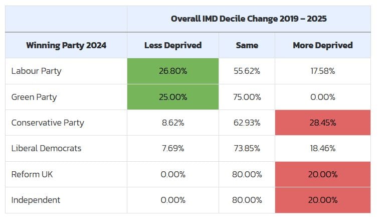 So 'Levelling Up' seems to have had a benefit economically but not politically. The other point of note is the strong correlation between Independents and Reform in poorer areas. Labour won the 20 poorest (IMD definition) seats but Reform and Independents were almost always 2nd party in those seats. So if things don't improve economically, you could argue that Reform/Independents will succeed at the expense of the other parties.