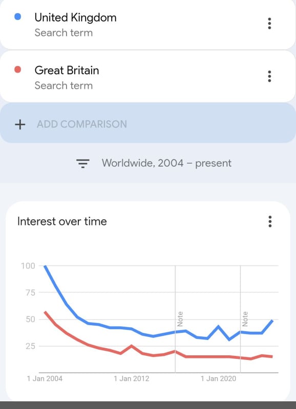 There's no evidence of increased use of United Kingdom over Great Britain
