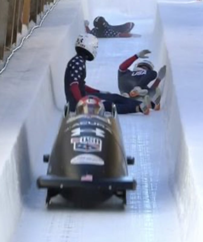A number of us were hit, but when my sled crashed we waited for the next to pass (there was enough space on the piste through the forest) then I pushed us off as fast as I could with my mate on the front steering. Unfortunately I jumped for the sleigh a bit too entusiastically and leapfrogged him and was run over by my own sleigh which had about 80kg of future GP steering as well as 20kg or so of sled. We were rolling about bruised and doubled up with laughter as the next sleigh went by. Then carried on with the run. I did have fairly significant bruising the next day.