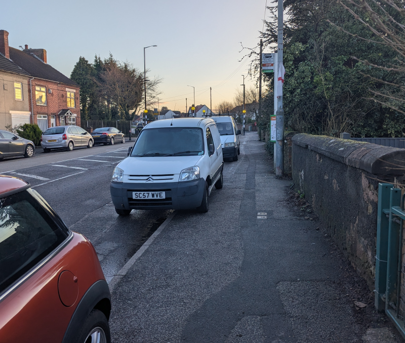 Here is a photo from this week. This is pavement parked vans entirely blocking a bus stop on a main road which up until the 1990s was the A38, outside a primary school, up against the white zig-zags for a zebra crossing -0 you can see the Belisha Beacons. All of the houses on that side at that point have big driveways. One school entrance is just beyond the zebra, the other is on a cul-de-sac behind where I stood to take the photo.