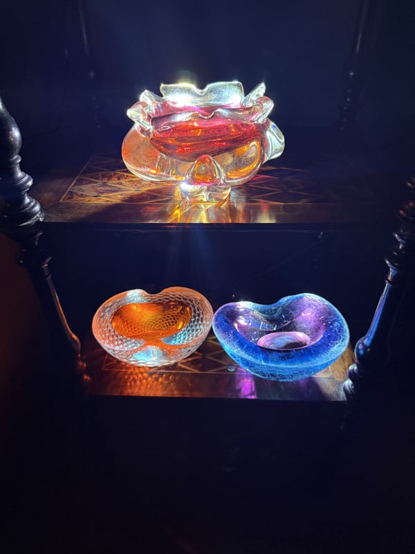 The south western corner of my sitting room now looks like this, with my self discovered antiquities (eg gobekli Tepe arrowhead) floating in vintage Murano glass on my lovely 1830s inlaid etagere
