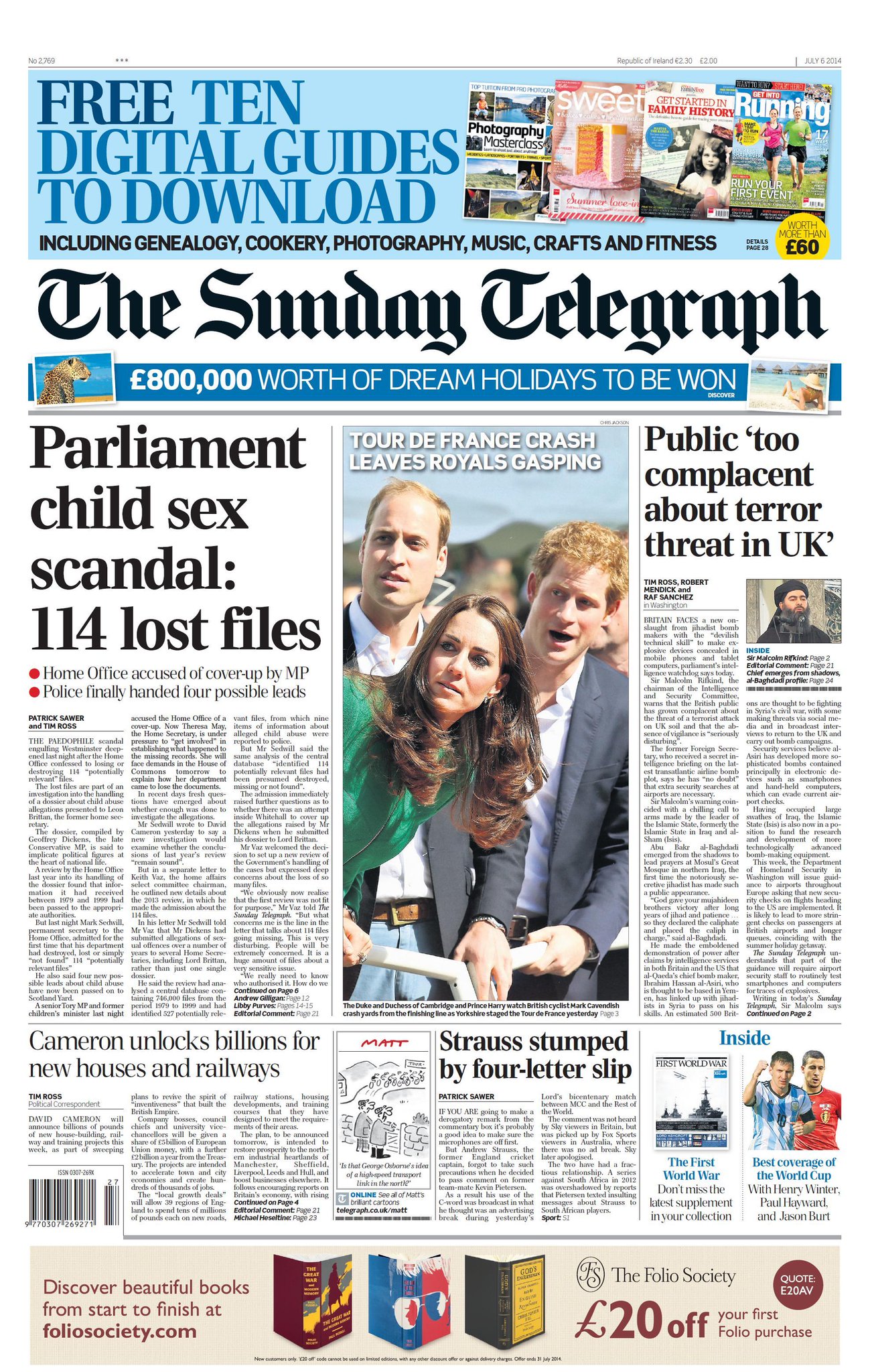 Sunday Telegraph front page - "Parliament child sex scandal: 114 lost files"