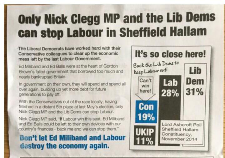 Apart from the curious way they've presented the Con and UKIP bars on the chart, the most interesting thing about that is they've chosen a message which emphasises 'working with our Conservative colleagues' so much. Somehow I don't think that will be the message in all the constituencies they are defending! Even in Sheffield Hallam, it looks a slightly high-risk approach.