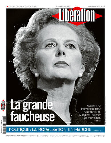 Of all the anti-Thatcher front pages, I think Liberation in Paris wins for a pithy representation of their view of her, and her passing - "La Grande Faucheuse" - "The Grim Reaper"