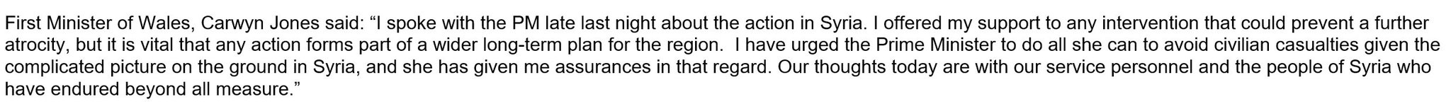 I'm surprised that May isn't going for a retrospective parliamentary vote as I think they would win that quite easily. It would have been far easier for a Tory MP to vote against action in Syria than to censure a Tory Prime Minister for an action that's already been taken.