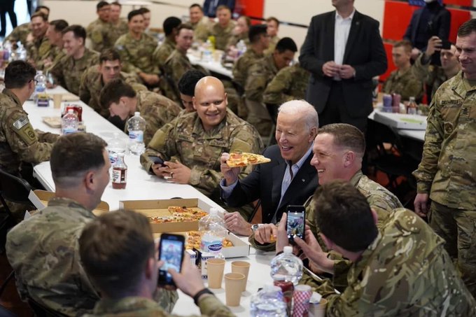 Note that Biden is eating a relatively thin based, crisp pizza. Toppings don't appear to include sweetcorn or pineapple.