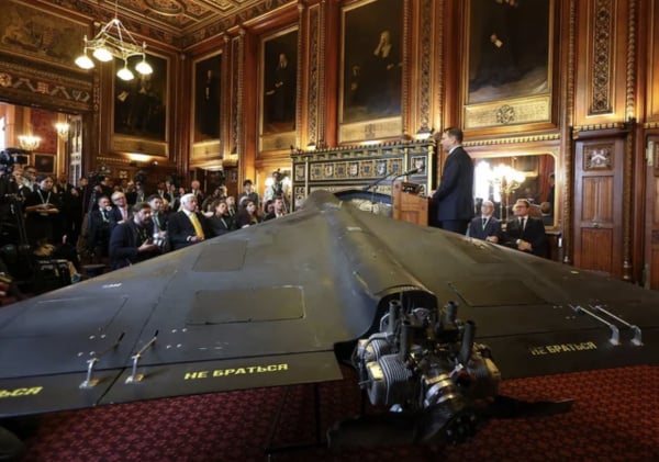 Poland's foreign minister Radosław Sikorski brings a Russian drone with him to speak at Westminster.