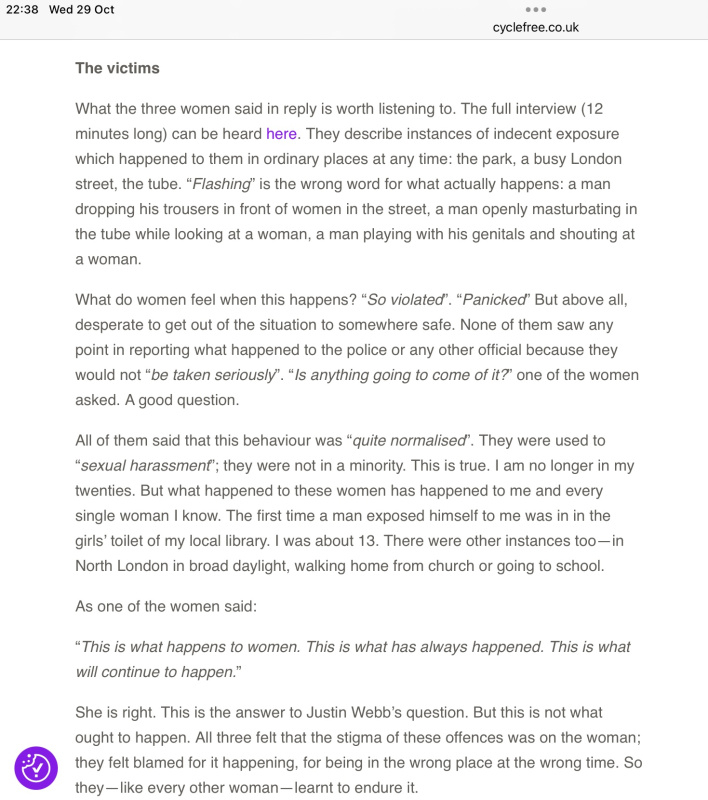 My point really is for women to not be made to feel like victims if they don’t actually feel that way. And they shouldn’t be forced to think they’re now damaged and need hours of therapy to get over an incident .