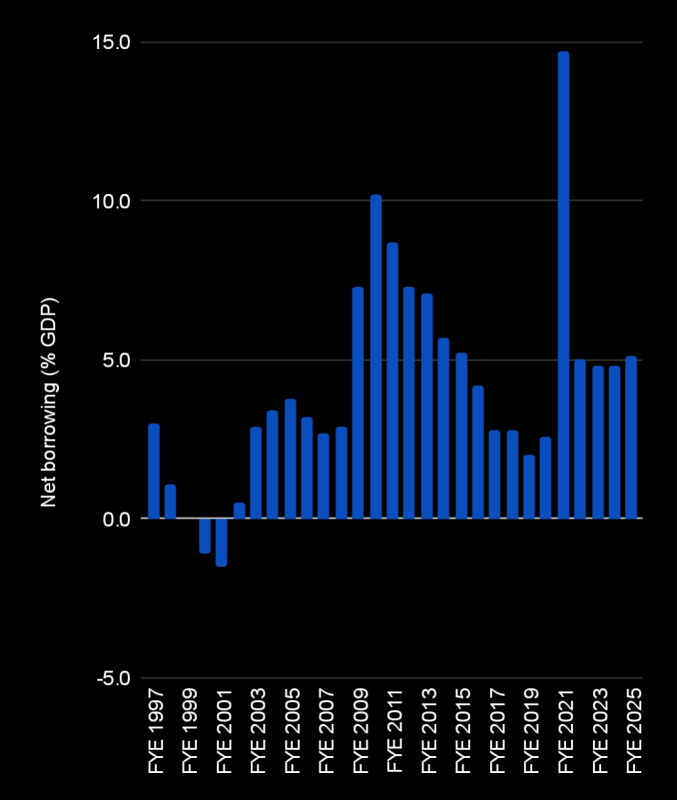 That BALLOONING deficit in full: I suspect we end up pretty close to 5% again this financial year. Maybe fiscal tightening will mean it drops a bit next year.