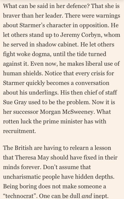 It’s actually a fantastic evisceration of Labour as a whole. Slightly @Stuartinromford -esque, it concludes that Starmer is a coward, Reeves is unfit for the role of Chancellor, and the best thing for the government is to leave both in place