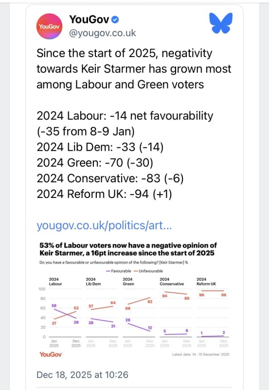?/ How has political opinion changed over 2025?In voting intention, Labour have made the biggest losses, while the Greens have gained most, and Reform UK have established a clear leadRef: 28% (+3 from 12-13 Jan)Lab: 18% (-8)Grn: 17% (+9)Con: 17% (-5)LD: 14% (=)yougov.co.uk/politics/art…