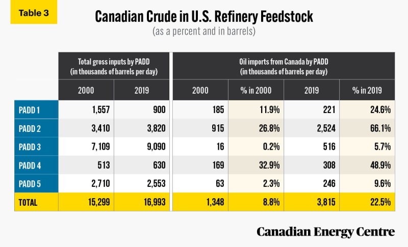 I make Canadian heavy crude imports to be 516k barrels per day in 2019, which is 5.7% of imports of oil to the Gulf Coast (which is PADD3) equal to 516/9090, and is 13.5% of Canadian oil imports equal to 516/3815.