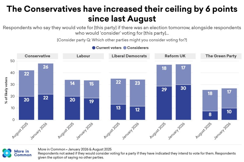 There is definitely a gap appearing for the Conservatives, with moderates giving up on Labour and Farage looking a bit stale. If they can drag Badenoch away from twitter and suppress all the "British ICE" stuff they might be onto a winner.