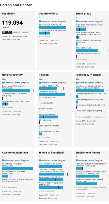 You can use the ONS to profile a constituency. Here is G&D. I can't see the appeal of Reform to the the voters there based on the ONS profile wrt ethnicity, working history and housing tenure. Goodwin is more and more looking like an odd choice. DYOR