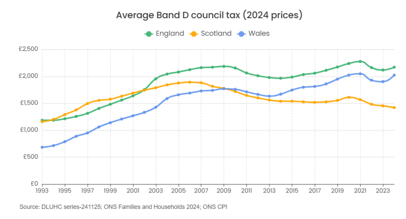 To take the numbers on a UK wide average per household (rather than Band D) the increase is still marginal. England is flat over 20 years, Wales is up, Scotland is down. Source ONS via Dan Neidle.