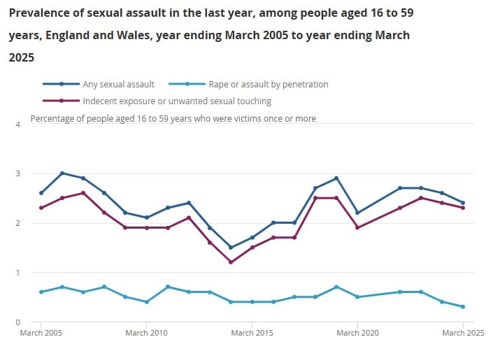 Despite no significant change in the prevalence of sexual assault experienced by people aged 16 to 59 years in the last year (2.4%) compared with YE March 2024 (2.6%), there has been a significant increase, compared with YE March 2015 (1.7%), after previously decreasing from YE March 2005 survey to YE March 2014 survey. [...] The prevalence of sexual assault among people aged 16 to 59 years has fluctuated between 1.5% and 3.0% over the last 20 years.