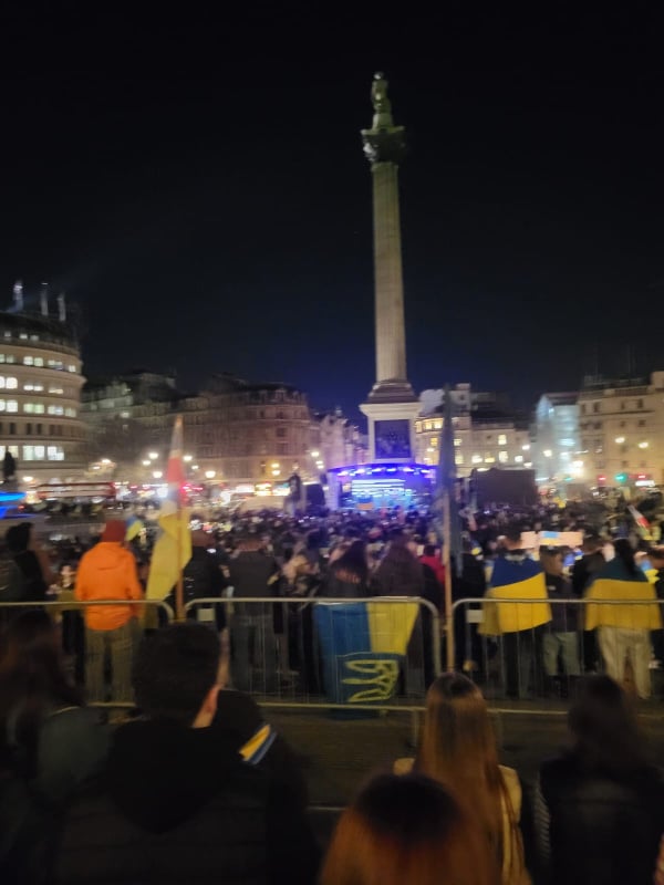 I attended the pro-Ukraine rally in Trafalgar Square yesterday evening. I'd say the mood was a bit more subdued than in previous years, though the turnout held up better than I thought it would as we go into the fifth year of this cruel and pointless war, probably partly because of the extremely warm weather for the time of year. The huge square was bathed in blue and yellow, and as always the floodlit Portland stone buildings made a good backdrop.