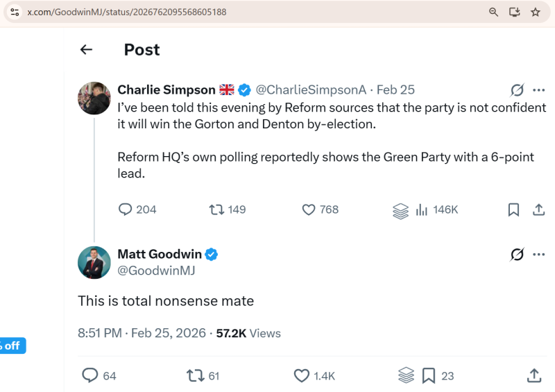 Translation: I am bum hurt after badly losing a by election because I was personally a shit candidate and if Reform lose the next election, we will not accept the result